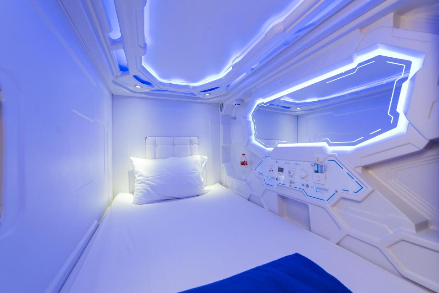Single Capsule. Featuring free toiletries, this single room includes a shared bathroom with a shower, a bidet and slippers. This single room has air conditioning, a dining area and a flat-screen TV. The unit has 1 bed. ;